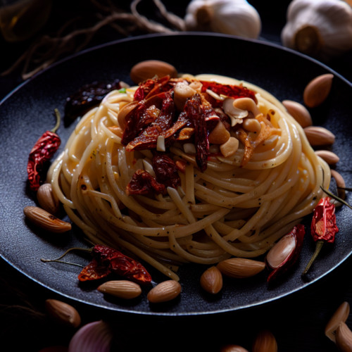 Spaghetti aglio, olio e peperoncino con pomodorini secchi e mandorle tostate