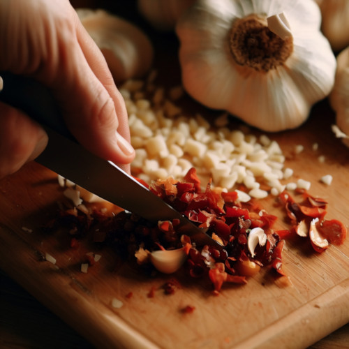 2. Mentre gli spaghetti cuociono, trita finemente gli spicchi di aglio e taglia a pezzetti i pomodorini secchi.